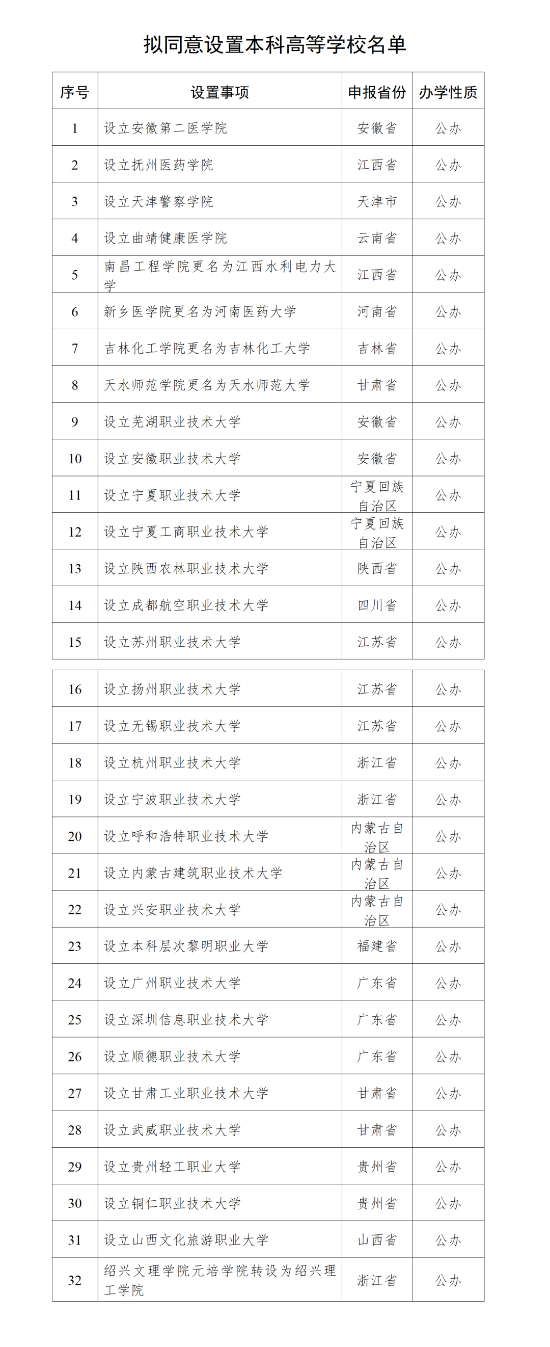 拟同意设置安徽第二医学院等32所学校,现予公示。